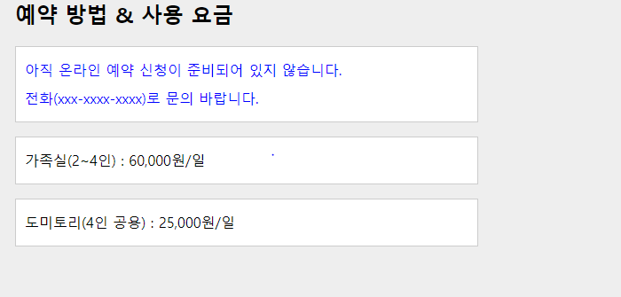 <p>아직 온라인 예약 신청이 준비되어 있지 않습니다. <br>전화(xxx-xxxx-xxxx)로 문의 바랍니다.</p>